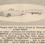 “Our fiberglass sports car (above) viewed by thousands at boat show! Molded 1-piece construction and streamlined design of this fiberglass car of tomorrow was the center of attraction daily for thousands of boat show visitors. Remember…..your fiberglass “Fisher-Craft” is made exactly like this fiberglass “Car-Of-Tomorrow”….built to take it right now….and for years and years to come!”