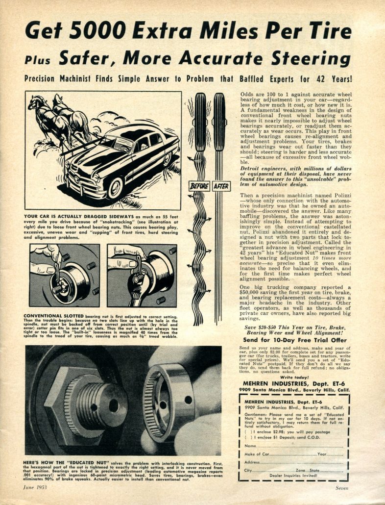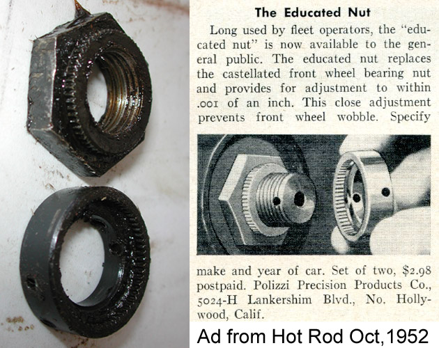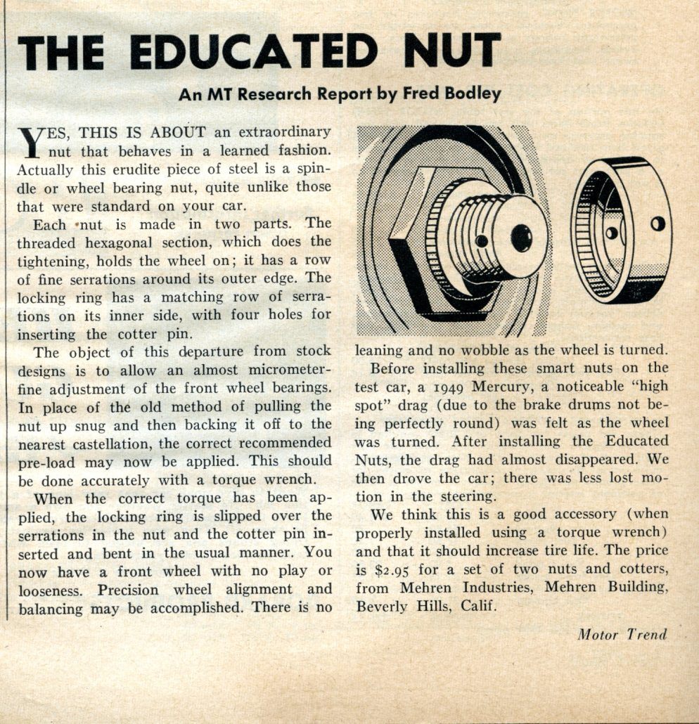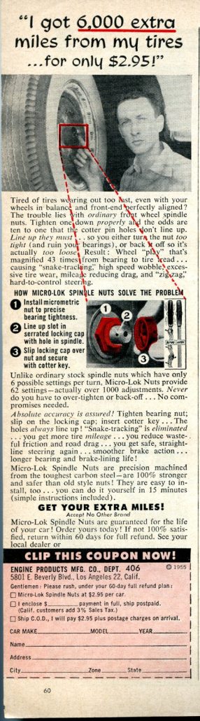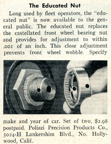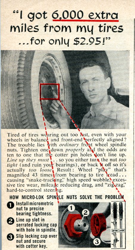 Educated Nut / Micro-Lok:  I’ve included the stories and ads for both of these items below.  The spindle nut accessory is kind of neat.  I never saw one until I took apart the front end of a vintage fiberglass car – it perplexed my friend Scott Miller and myself.  It was neat, but we had no idea of the heritage of this part.