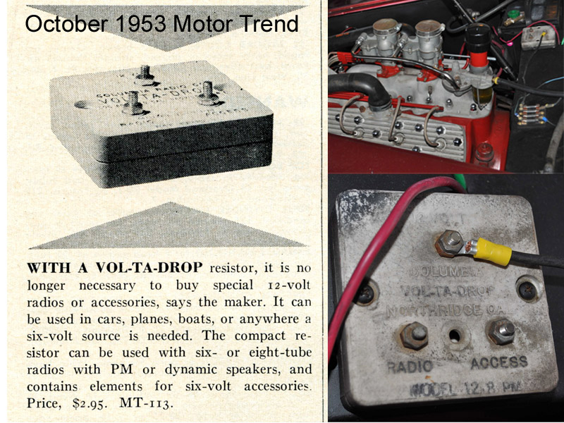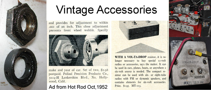 Vol-Ta-Drop:  This is a nice piece too.  If any of you have 6 volt systems and are going to upgrade to a 12 volt battery – you may need something like this. For our vintage fiberglass cars, there are few accessories – mostly light bulbs in the head/tail lights and the dash.  But for a custom guy in the 1950’s, if you were taking your 6 volt car to 12 volts – this accessory would have saved you time and money.  Upgrading your 6 volt car to 12 volts involves many changes – but this is an accessory that would save you time on any car.