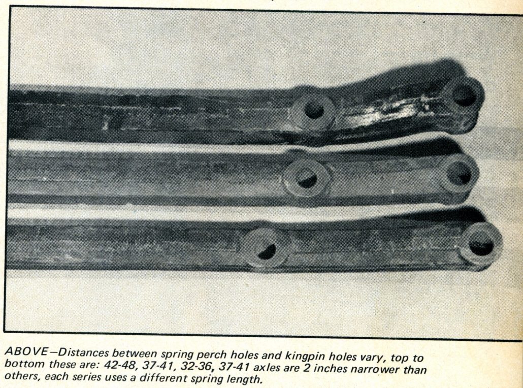 - Here the Author (Neil East) Noted That The Distances Between Spring Perch Holes and Kingpins Varied. From Top to Bottom: 1: 1942-1948; 2: 1937-1941; 3: 1932-1936. The 1937-1941 Front Axles are 2 Inches Narrower Than Others, and Each of These Axles Uses a Different Leaf Spring Length.