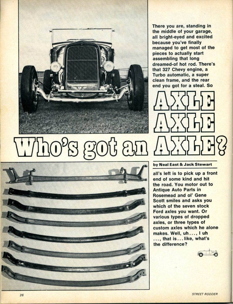 The best article I’ve found on Ford axles was the June 1972 issue of Street Rodder – volume 1, issue #2 – just the second issue off the press. I knew about the existence of an article, but had a hard time tracking it down. However, a quick phone call to Neal East – friend of fiberglass and one of the authors of this article, quickly identified the correct month and year of the magazine to look for – and a healthy discussion of the topic ensued.