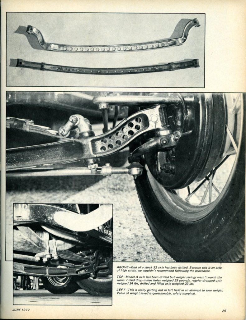 In addition to the seven Ford stock axles produced, there were various types of “dropped” axles too. Using a “dropped” axle means you can bring the chassis closer to the ground for low, lean, and mean look to your special. This was important back then and remains a key design feature of specials today. Neal discussed the advantages of these types of axles and shows some great pictures of dropped axles in the article. In addition, he also discussed modified axles which include “drilled axles” and some of the dangers of making these modifications.
