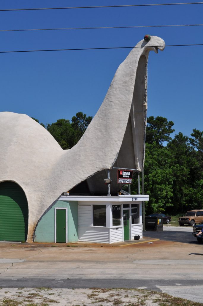 There’s a lot of vintage Florida left over from the 1930’s, 1940’s, and 1950’s.  And dinosaur themed attractions and buildings were popular down here way before the movie Jurassic Park.   So we left Tampa and headed north.  And more north.  And even more north.  And after we just about gave up….we found what we were looking for.  A long-lost (to us) dinosaur roadside gas station and auto repair that we remembered from our youth.