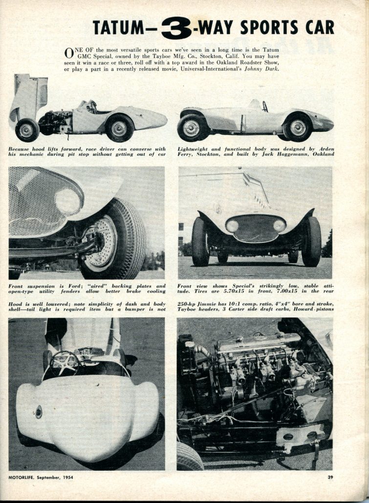 After the war, he started racing in Stockton California. I recently found newspaper articles of his exploits from 1949. Chuck continued racing through the 1950’s and beyond. His personal racecar – the “Tatum Special” which was built from scratch – was on the cover of Motor Life in August 1954, featured in Car Craft December 1953, MotorLife September 1954, Hot Rod October 1953, and others as well.