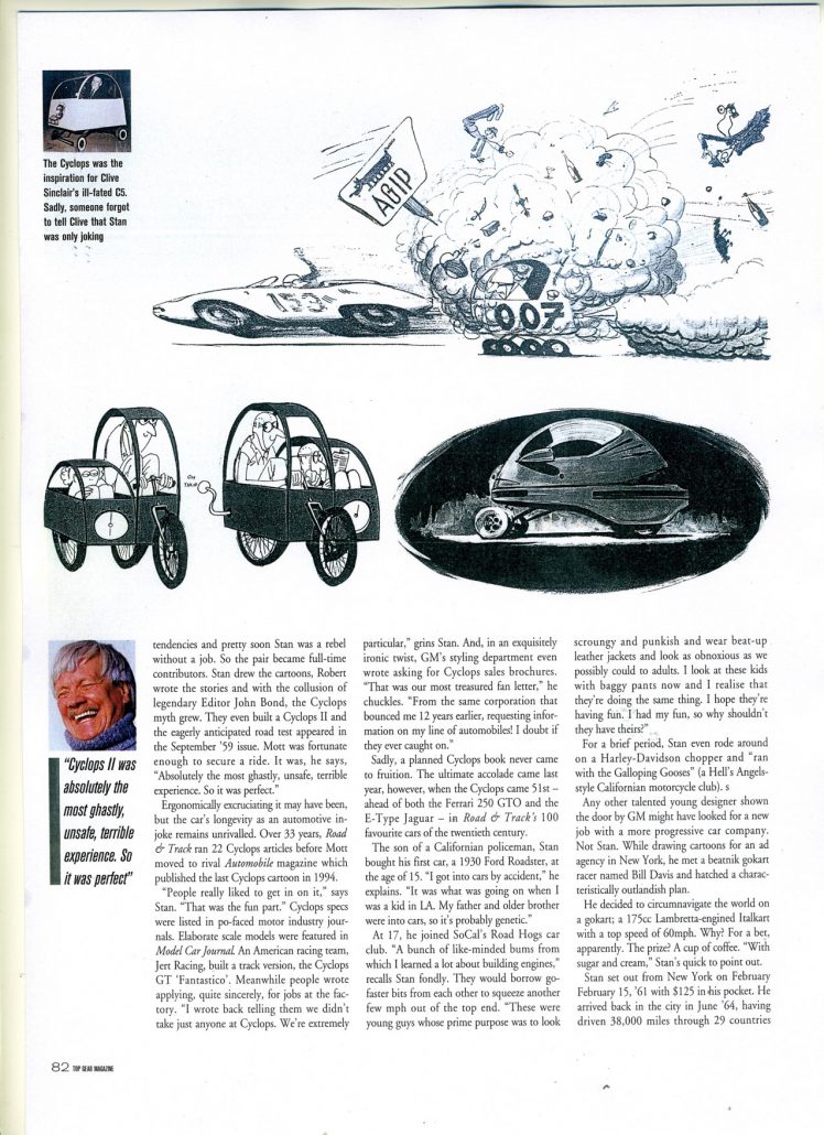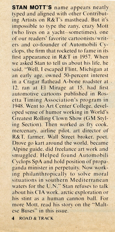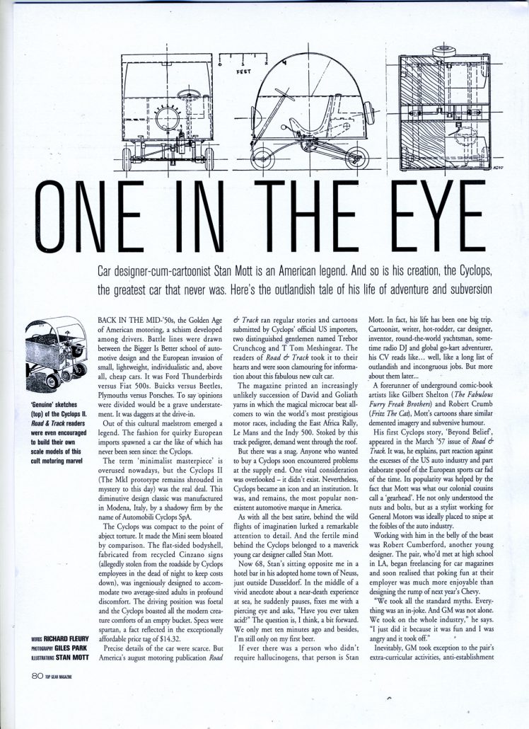 Stan Mott and his good friend Robert Cumberford also launched the epic story and car legend called the “Cyclops”. This came out first in the March 1957 issue of Road & Track, and started a many year humorous run about a car – that never was.