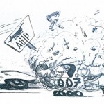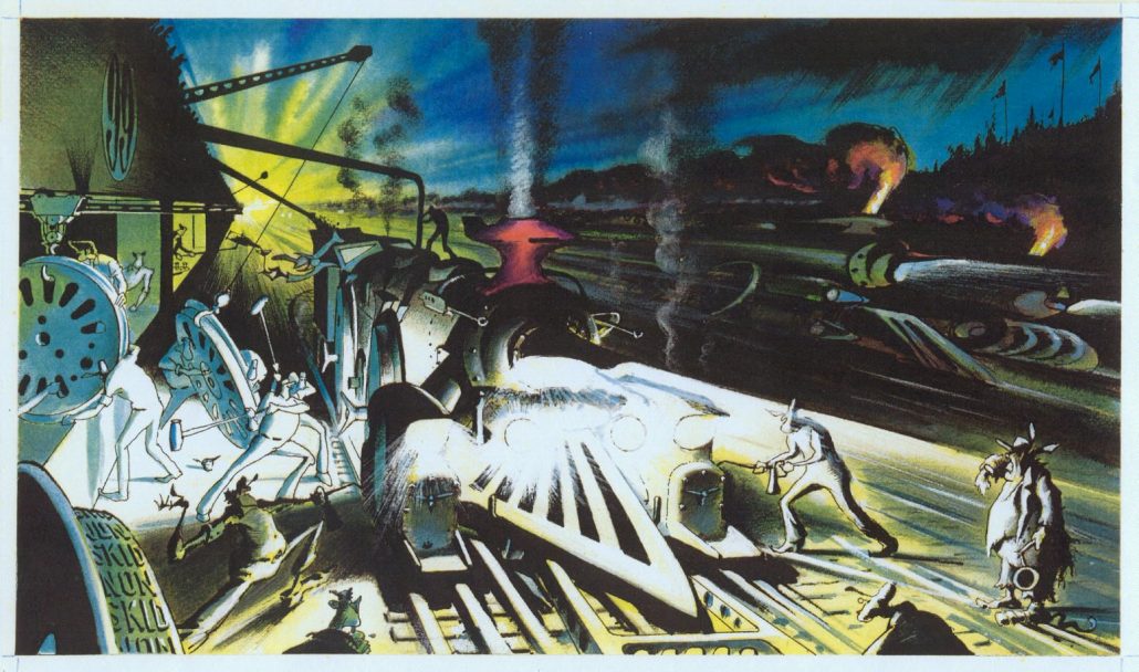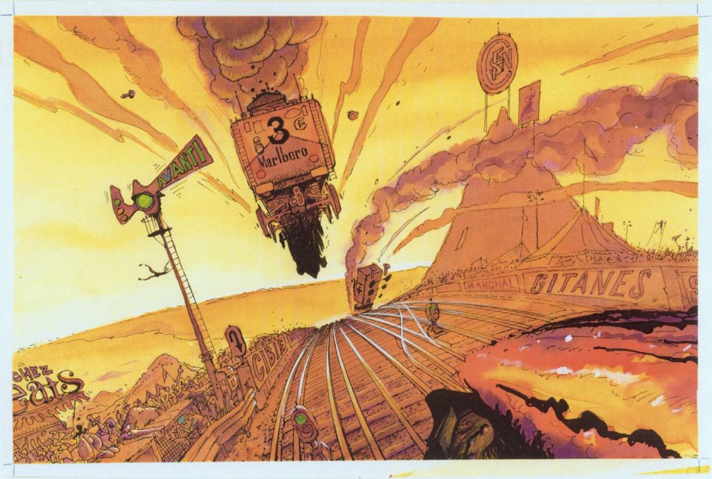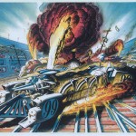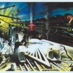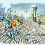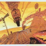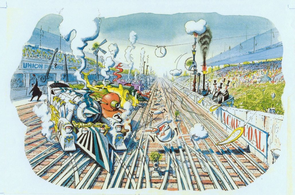 The first set of drawings I saw were Stan’s interpretation of the 24 Hours of Le Mans – but using Locomotives instead of automobiles. The 5 panels I’ve seen (and are shown below) are titled “Les 24 Heures de Choo-Choo”. Who could imagine such a neat approach to this honored event – in a completely different way? I found out “who” quickly. Checkout the signs along pit row that mimic famous sponsors in every way. It’s wonderful to appreciate.