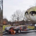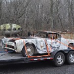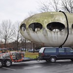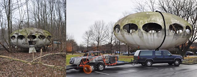 Forgotten Fiberglass has taken on the task of saving, dismantling, transporting, and restoring this legendary piece of fiberglass. This saucer has been saved, and our team assembled to bring it home early this Spring. Some of you may think we can take it home as easily as the picture below suggests. I wish that were the case (thanks to good fiber-friend Harold Pace for the picture below).