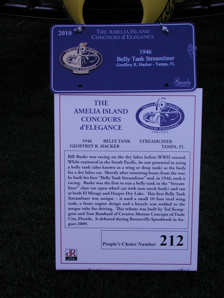 But…thanks to Amelia Island Concours d’Elegance, the story and travels of the Bill Burke Belly Tank continued. Bill Warner was kind enough to ask about and accept the tank for display during the Concours, and this made another first for our tank – The first belly tank streamliner on display at a world class concours – The Bill Burke Belly Tank Streamliner.