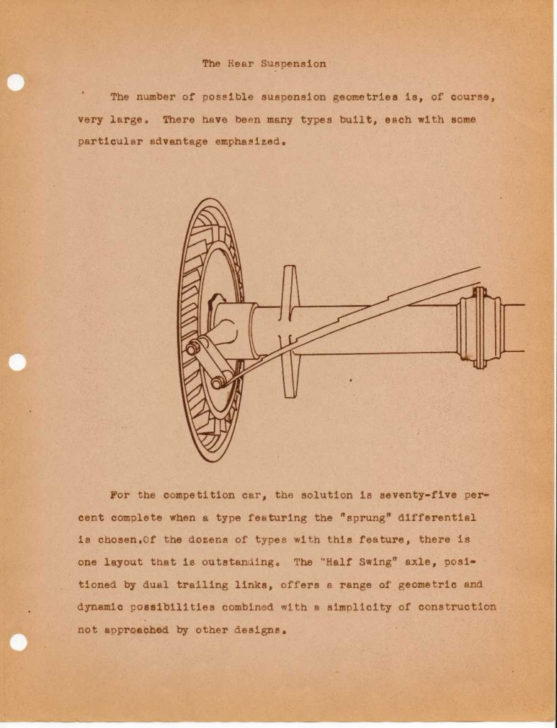 Of the dozens of types with this feature, there is one layout that is outstanding. The “Half Swing” axle, positioned by dual trailing links, offers a range of geometric and dynamic possibilities combined with a simplicity of construction not approached by other designs.