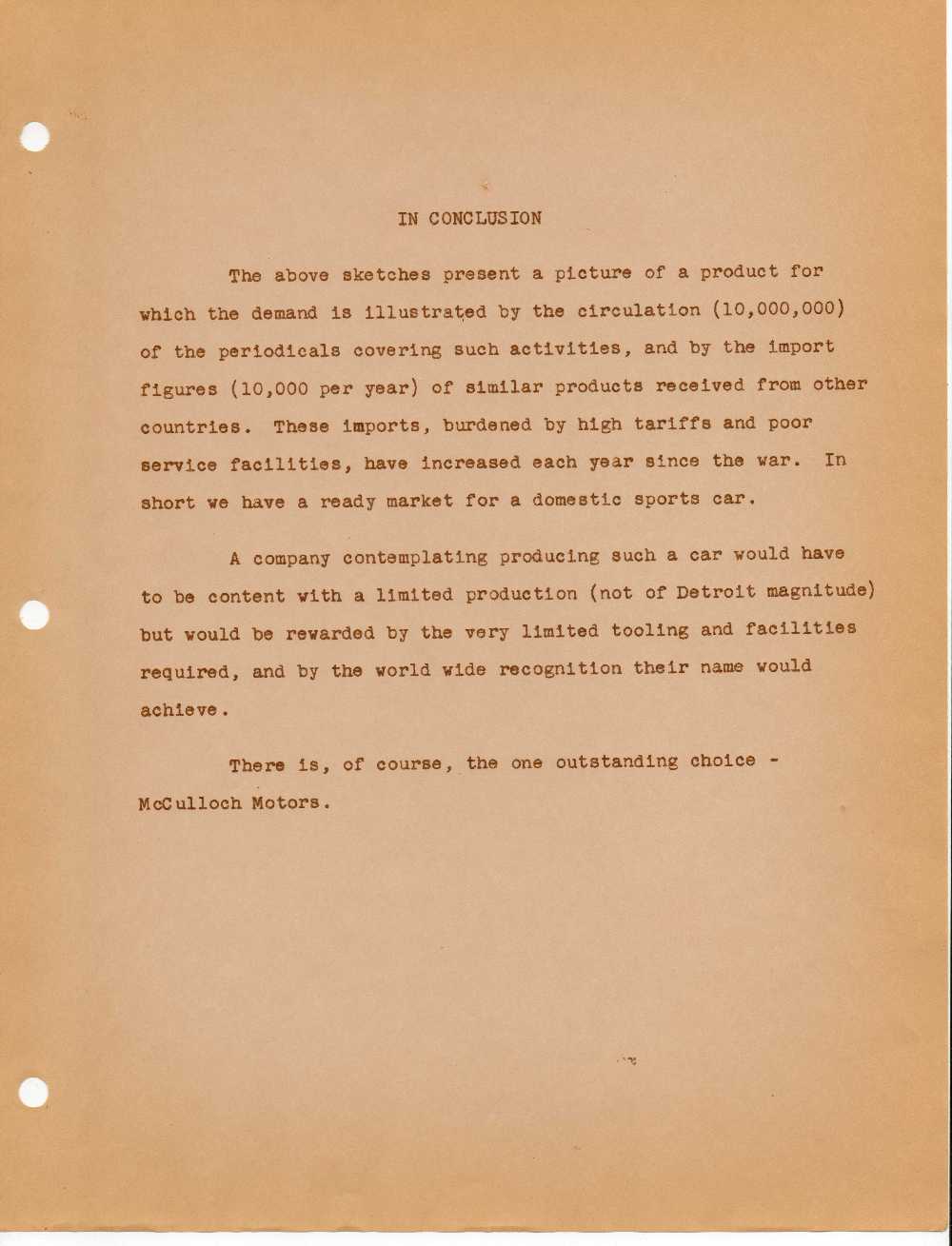 The above sketches present a picture of a product for which the demand is illustrated by the circulation (10,000,000) of the periodicals covering such activities, and by the import figures (10,000 per year) of similar products received from other countries.  These imports, burdened by high tariffs and poor service facilities, have increased each year since the war. In short we have a ready market for a domestic sports car.