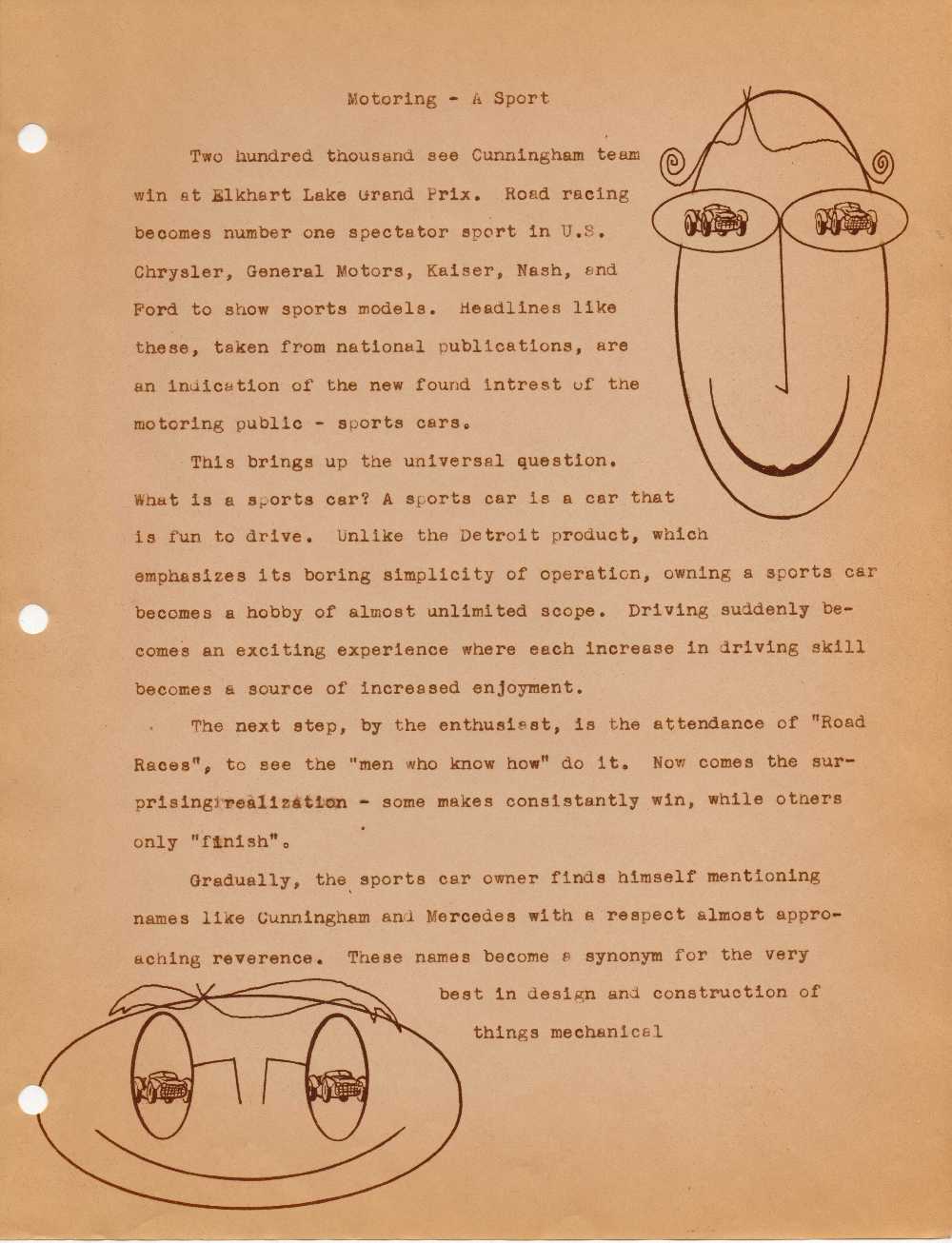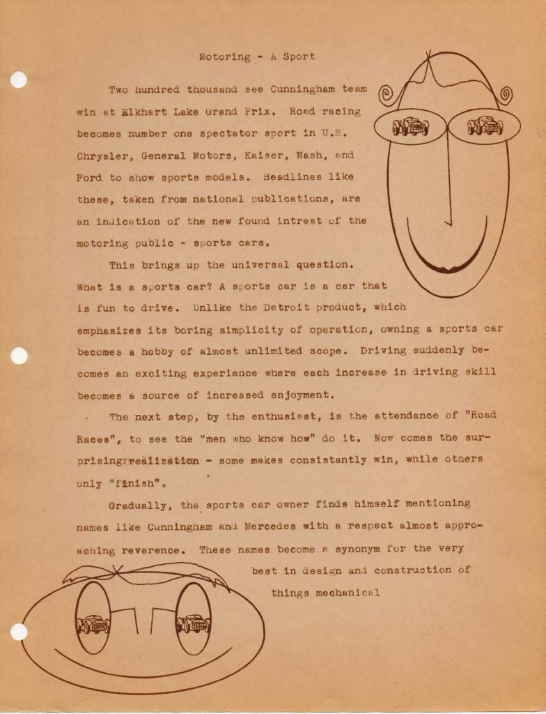 Two hundred thousand see Cunningham team win at Elkhart Lake Grand Prix. Road racing becomes number one spectator sport in U.S.  Chrysler, General Motors, Kaiser, Nash, and Ford to show sports models.  Headlines like these, taken from national publications, are an indication of the new found interest of the motoring public – sports cars.