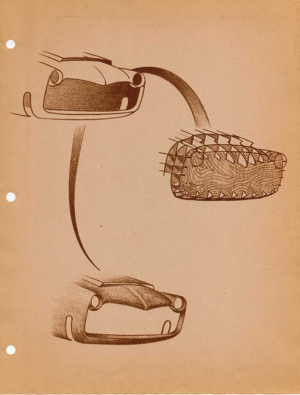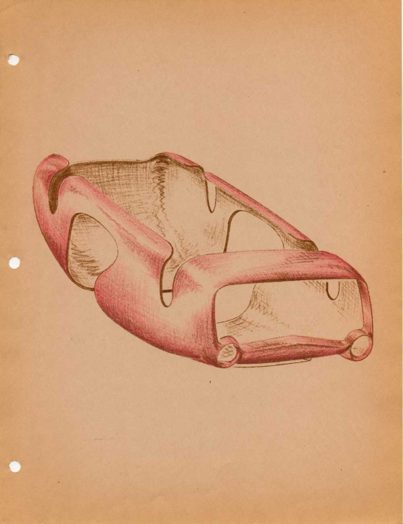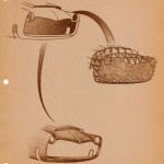 It shows how he wanted the body to be constructed, a single central body with attached winged fenders, and how he wanted to construct his “half swing” axles that he mentioned in other articles that have been posted here on Forgotten Fiberglass.  The illustrations also show an example of how the tooling would be constructed