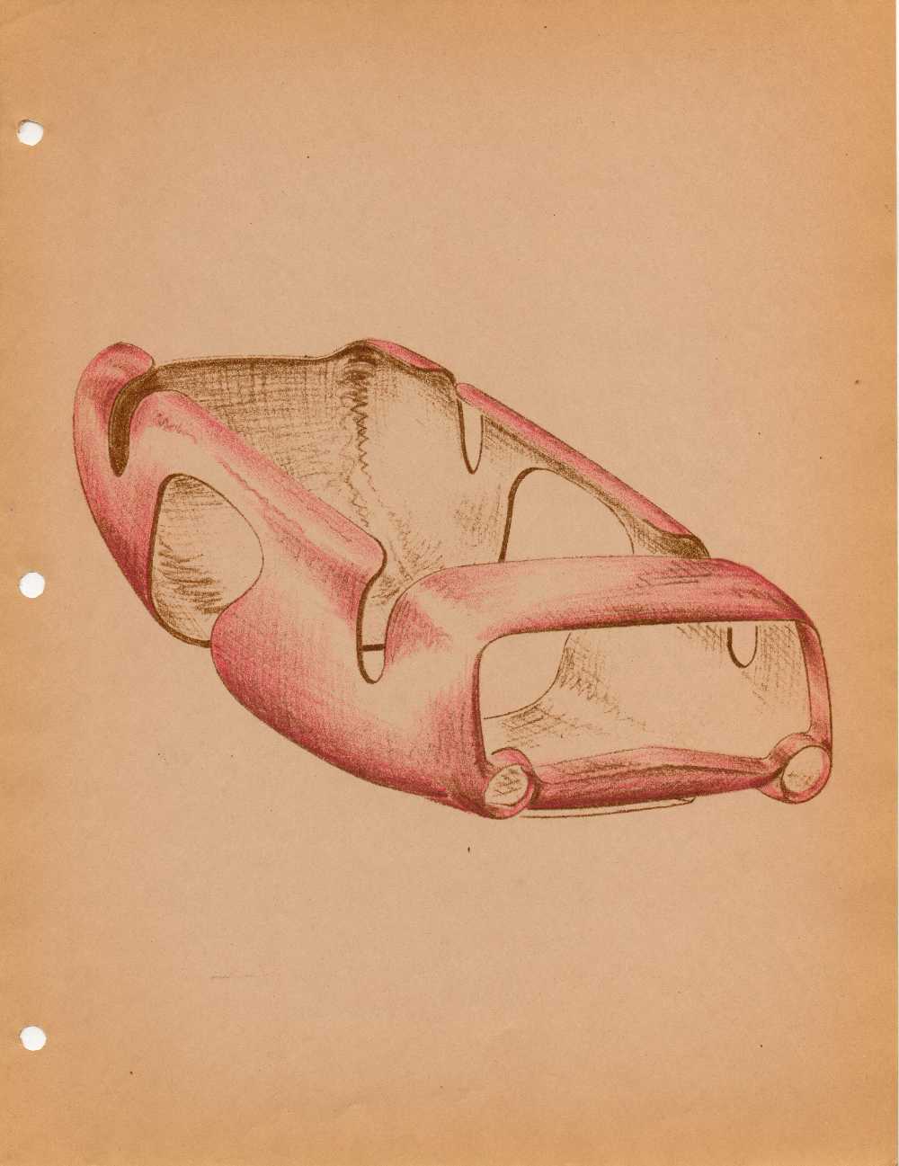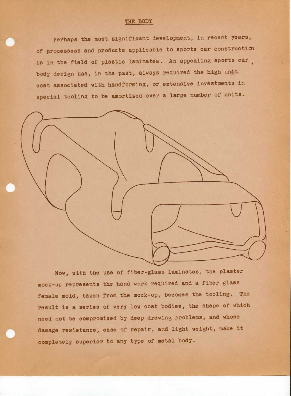 Now, with the use of fiber-glass laminates, the plaster mock-up represents the hand work required and a fiber glass female mold, taken from the mock-up, becomes the tooling.  The result is a series of very low cost bodies, the shape of which need not be compromised by deep drawing problems, and whose damage resistance, ease of repair, and light weight, make it completely superior to any type of metal body.
