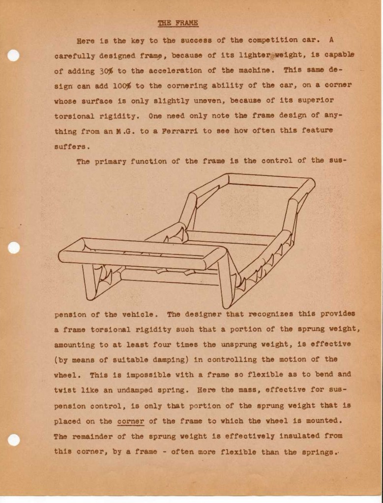 And the comment , “There is, of course, the one outstanding choice – McCulloch Motors”, I think this is just a tongue in cheek comment about the Supercharger company. I think he is just saying, “you could consider all the above statements about frame design and chassis development or you could just spend the money to supercharge your car and to get more horsepower to overcome your shortcomings elsewhere in your car. At least, that’s what the advertisements for the supercharger would lead you to believe…wink” . Again, what do I know.