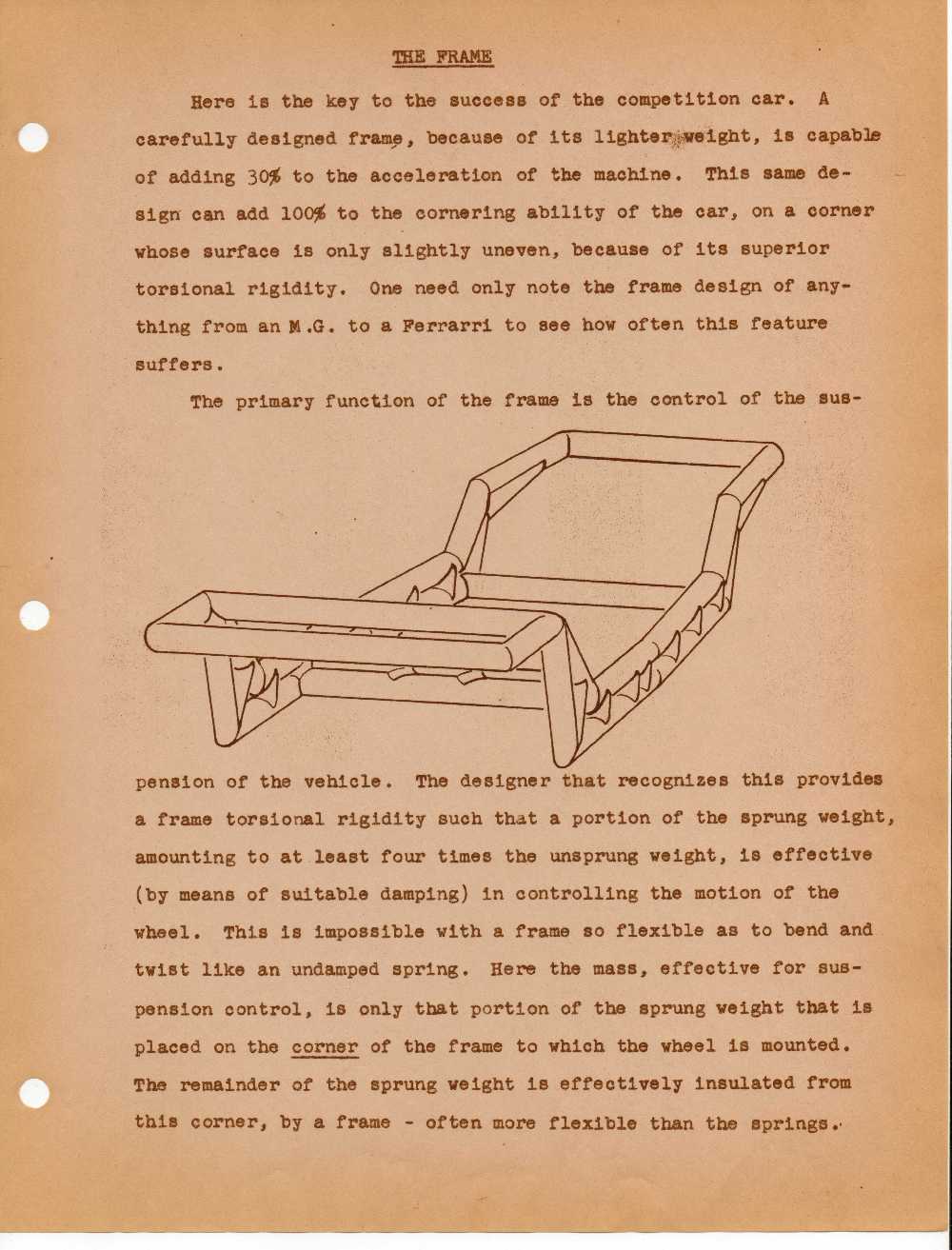 One need only note the frame design of anything from and M.G. to a Ferrari to see how often this feature suffers. The primary function of the frame is the control of the suspension of the vehicle.  The designer that recognizes this provides a frame torsional rigidity such that a portion of the sprung weight, amounting to at least four times the unsprung weight, is effective (by means of suitable damping) in controlling the motion of the wheel.