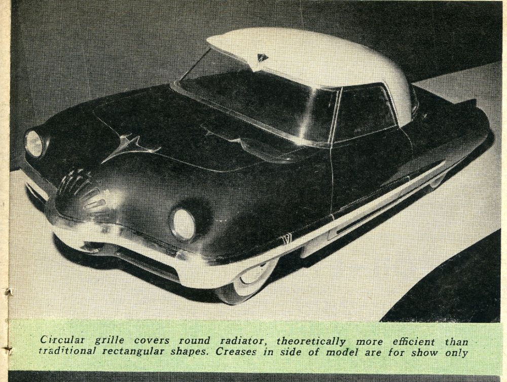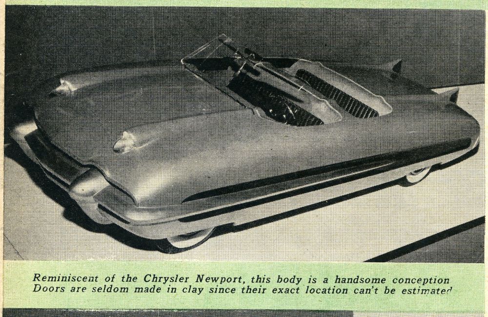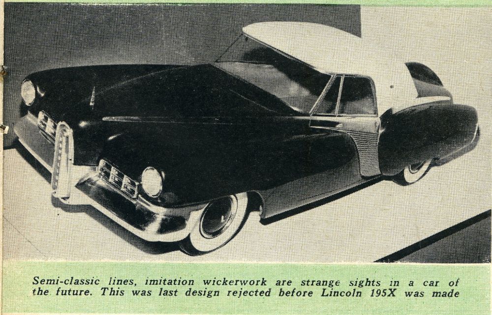 Today’s article highlights some pretty neat concept models from back then – and these were from the Ford Styling Department. One model has hauntingly similar lines to the mystery car that Darren Swanson owns that ‘ought to rock his world. My favorite is the model with “semi-classic lines” with imitation wickerwork on the doors. Of course I’ve always tended to like the extremes of design, so no surprise there.