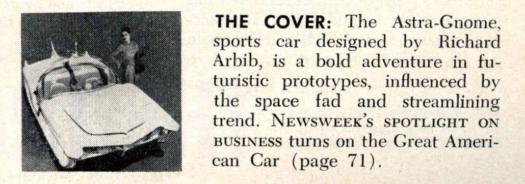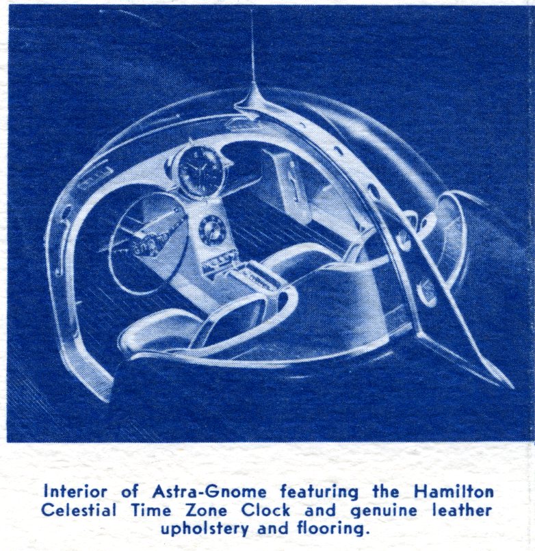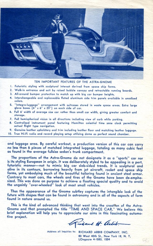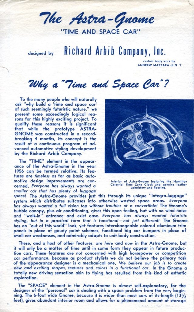 To the many people who will naturally ask “why build a ‘time and space car’ of such seemingly futuristic nature,” we present some exceedingly logical reasons for this highly exciting project. To qualify these reasons it is significant that while the prototype Astra-Gnome was constructed in a record breaking 4 months, its concept is the result of a continuous program of advanced automotive styling development by the Richard Arbib Company.