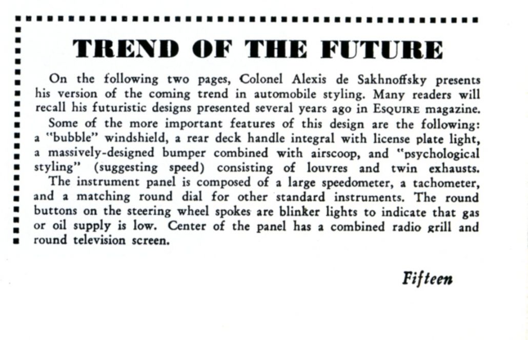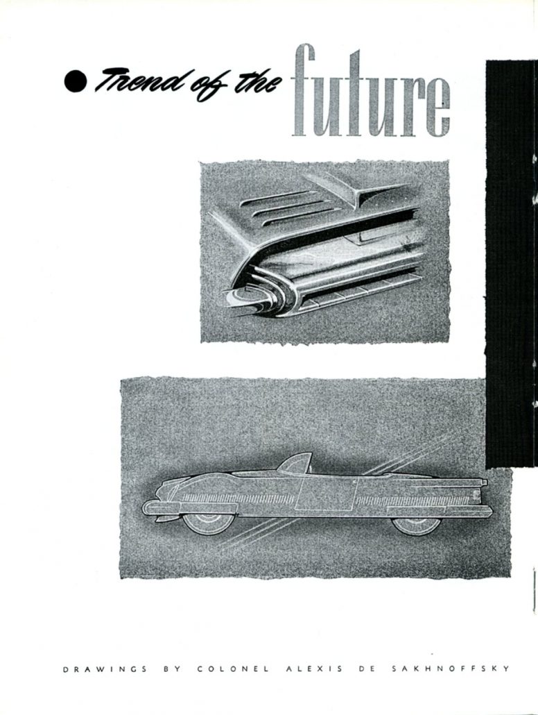 On the following two pages, Colonel Alexis de Sakhnoffsky presents his version of the coming trend in automobile styling. Many readers will recall his futuristic designs presented several years ago in Esquire magazine.