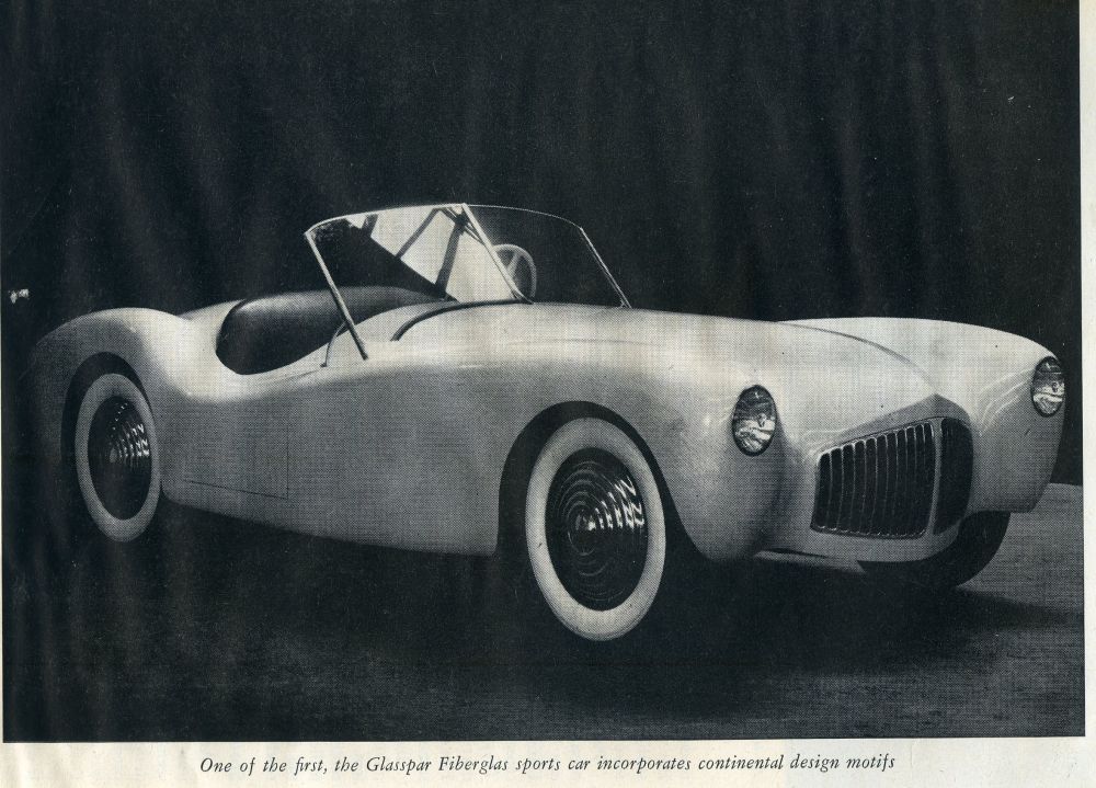 Given that this article is 18 pages long, I’ll be dividing up the article in about 10 or so “parts” and discussing each of those “parts” over the course of the next several weeks.  This will make it more digestible for everyone to read.  And…it allows us to focus on one aspect or car marque at a time.  Our first article in this series focuses on the author’s introduction of fiberglass to his readers.  And it’s interesting to note that even in 1954, he was using the word “spaceship” to describe the futuristic and high technological aspect of fiberglass in the public’s view.