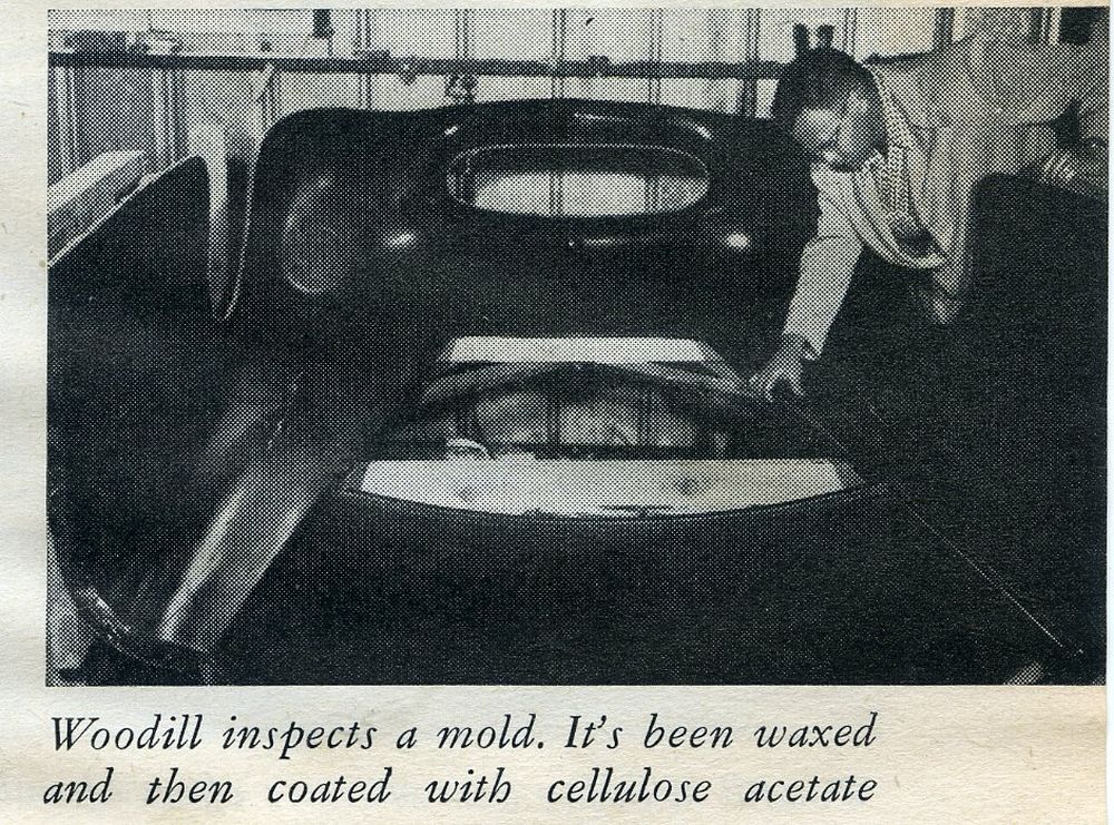It was at this point that Woodill decided to separate the body manufacture from the chassis construction and assembly.  He planned to produce the frames and under-body components at the factory as well as actual assembly, but he decided to turn the production of the Fiberglas body over to more specialized hands.  He chose the Glasspar Company because of their outstanding record.
