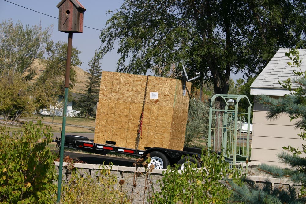 I am enclosing pictures of the shipping crate as viewed from our bedroom window. It is setting on my trailer held on with a logging chain and boomer. The street going past the driveway with the trailer is one of the main ones coming into town so many neighbors have seen it and are wondering what it is.