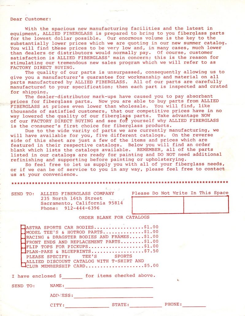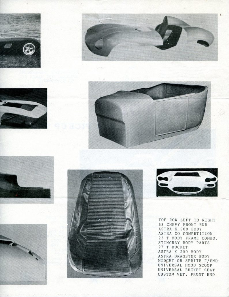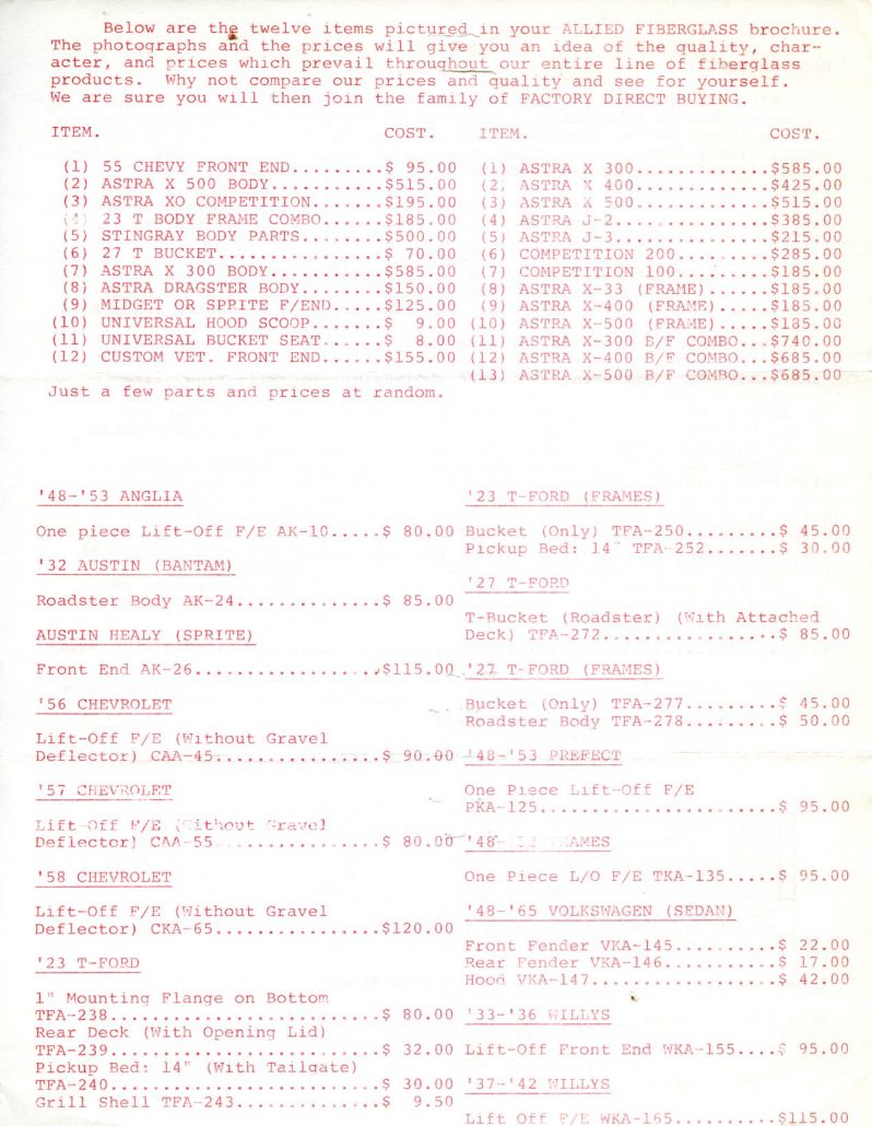 This is a short one – just 4 pages and includes an insert sales sheet – but this catalog shows the product line of Allied nicely. The company used the name “Astra” thru at least early ’63, and then in ’64 or ’65 started using the “Allied” name for their company. We’re still in the process of identifying the exact year of the name change. The name “Astra” still accurately described their sports car bodies thru the transition to their new name.