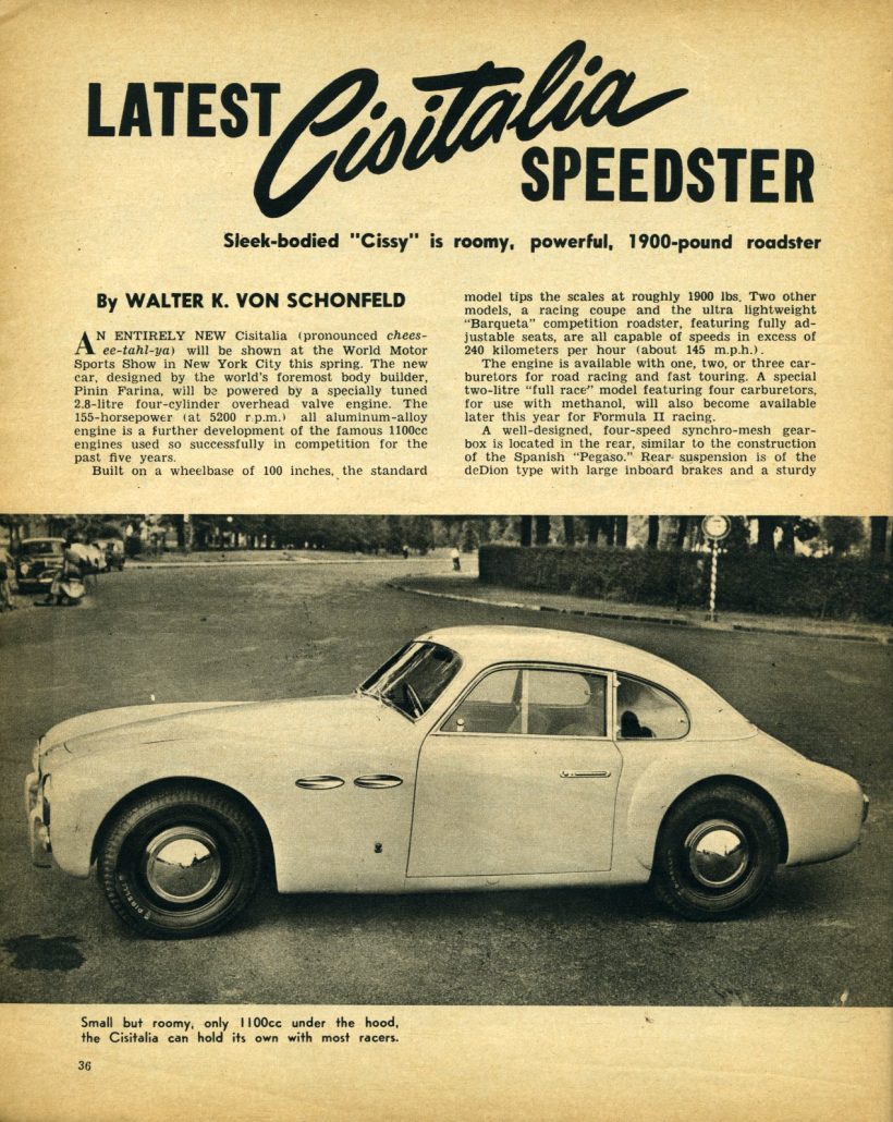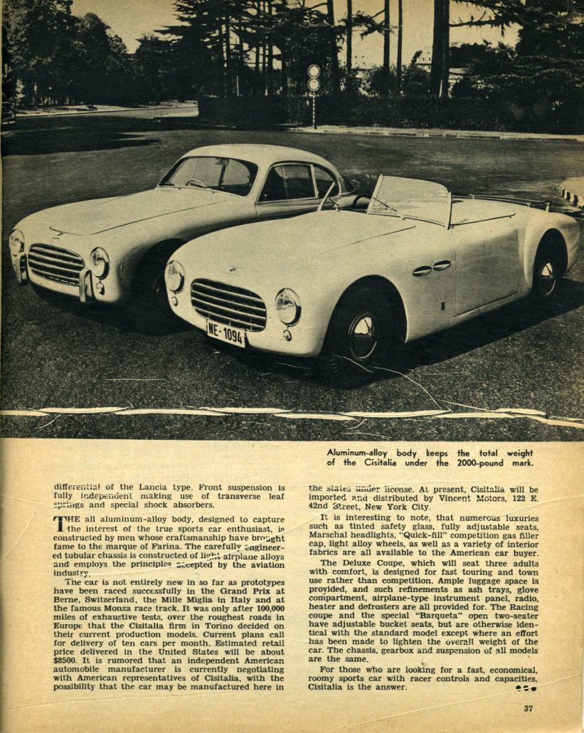 Current plans call for delivery of ten cars per month. Estimated retail price delivered in the United States will be about $8500. It is rumored that an independent American automobile manufacturer is currently negotiating with American representatives of Cisitalia, with the possibility that the car may be manufactured here in the states under license. At present, Cisitalia will be imported and distributed by Vincent Motors, 122 E. 42nd Street, New York City.