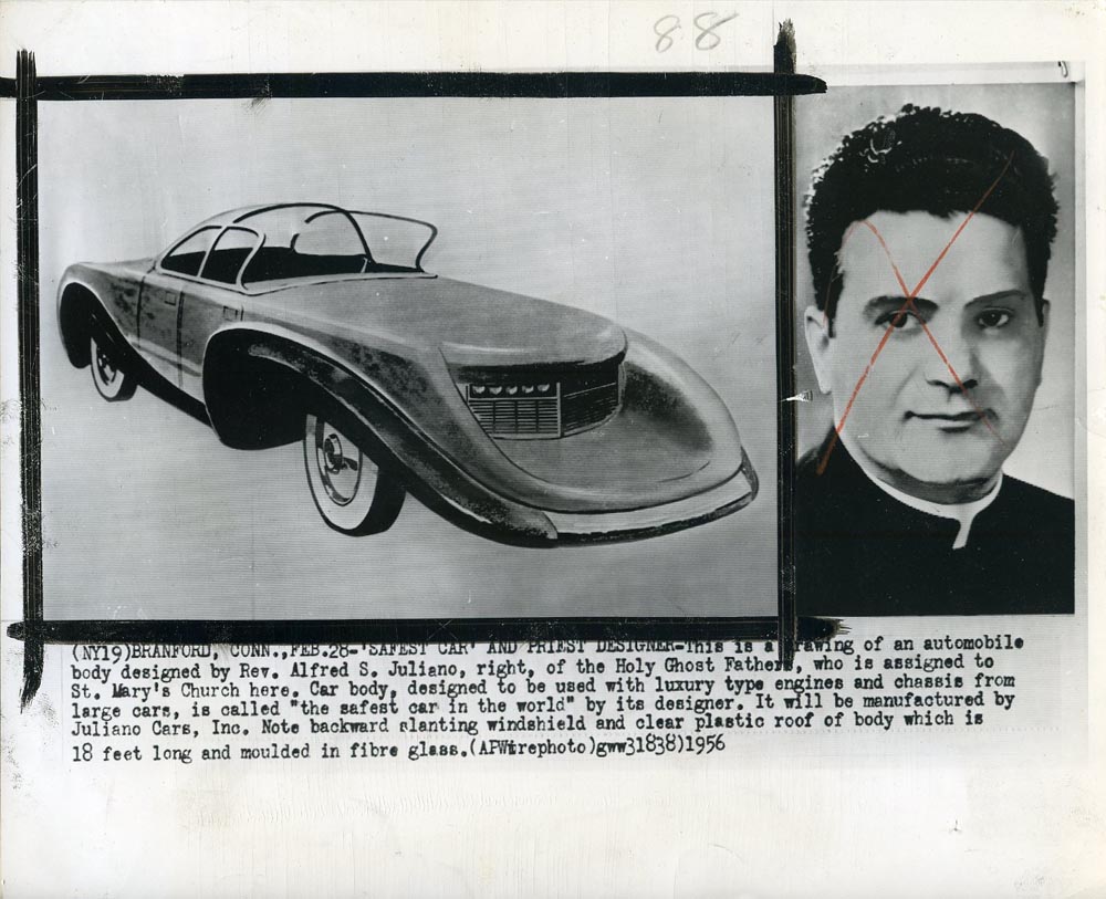 This is a drawing of an automobile body designed by Reverend Alfred S. Juliano, right, of the Holy Ghost Fathers, who is assigned to St. Mary’s Church here.  Car body, designed to be used with luxury type engines and chassis from large cars, is called “the safest car in the world” by its designer.