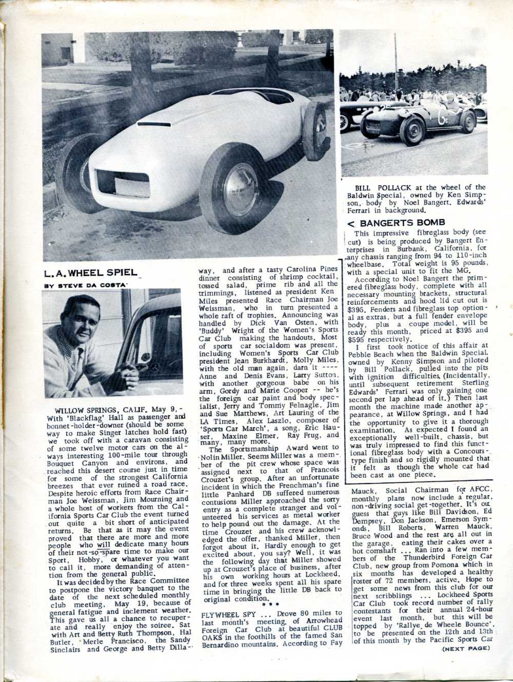 According to Noel Bangert the primered fiberglass body, complete with all necessary mounting brackets, structural reinforcements and hood lid cut out is $395. Fenders and fiberglass top optional as extras, but a full fender envelope body, plus a coupe model, will be ready this month, priced at $395 and $595 respectively.