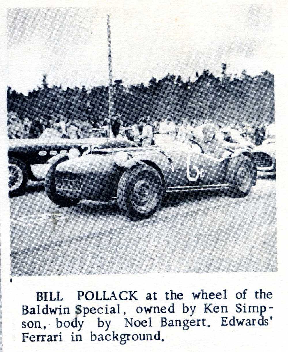 I first took notice of this affair at Pebble Beach when the Baldwin Special, owned by Kenny Simpson and piloted by Bill Pollack, pulled into the pits with ignition difficulties. (Incidentally, until subsequent retirement, Sterling Edwards’ Ferrari was only gaining one second per lap ahead of it).