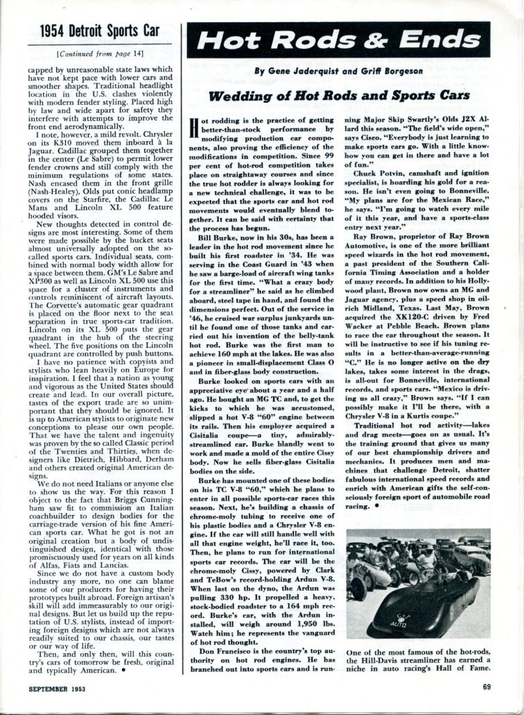 In their column that month, they featured how “hot rods” and “sports cars” were coming together in design and performance.  And a bit of history too.  They also covered achievements, actions, and thoughts of Chuck Potvin, Ray Brown, Don Francisco, and most importantly….Bill Burke.