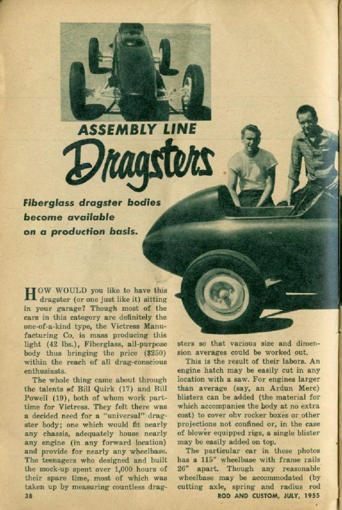 Recently, we discussed the Victress Dragster which became a reality in ’55-’56. Bill Quirk and Bill Powell of Victress Manufacturing put forth innovation, hard-work, and determination to make this concept a reality for themselves and potentially others. Today I found a two-page article on the creation of this car – sans engine. Let’s have a look!