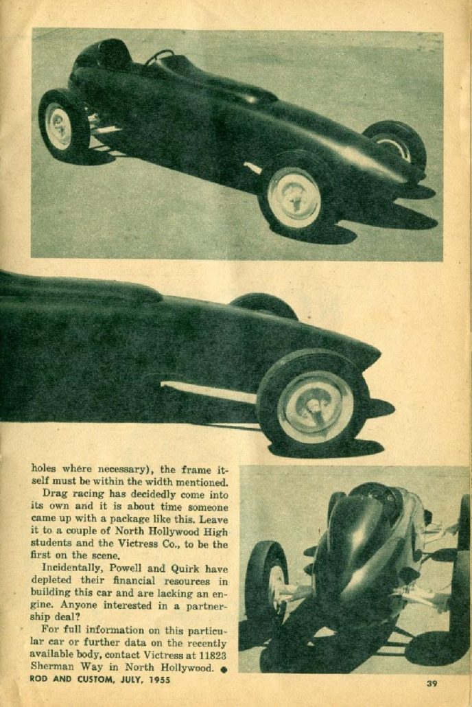 The whole thing came about through the talents of Bill Quirk (17) and Bill Powell (19), both of whom work part-time for Victress. They felt there was a decided need for a “universal” dragster body; one which would fit nearly any chassis, adequately house nearly any engine (in any forward location) and provide for nearly any wheelbase.