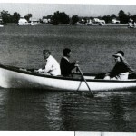 The second photo is of dad rowing a Dincat with Bill Hubater sitting ahead of him and, who appears to be, my grandmother “Joe” and another party in the stern seat. I have a copy of this one as well. It is out in Newport Harbor, but not in front of the Glasspar shop, since that was in Costa Mesa, not on the bay in Newport.