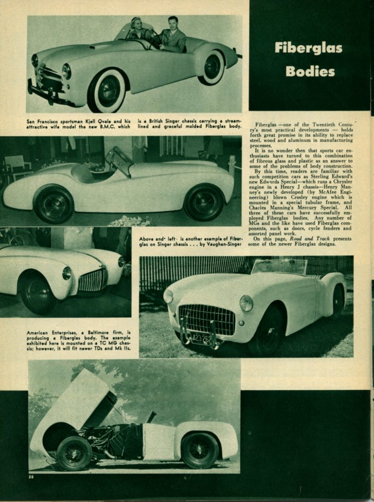 Fiberglass – one of the Twentieth Century’s most practical developments – holds forth great promise in its ability to replace steel, wood and aluminum in manufacturing processes. It is no wonder then that sports car enthusiasts have turned to this combination of fibrous glass and plastic as an answer to some of the problems of body construction.