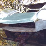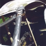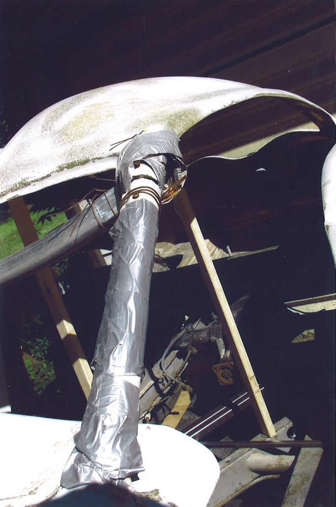 The rear window pillars were the only intact roof support for the roof. I used a center roof strap to keep the roof from being blown off. Because of the center strap tension to hold the roof in place, it also added to the center roof splitting. The front roof center had split because of the windshield posts gave no support to the roof.