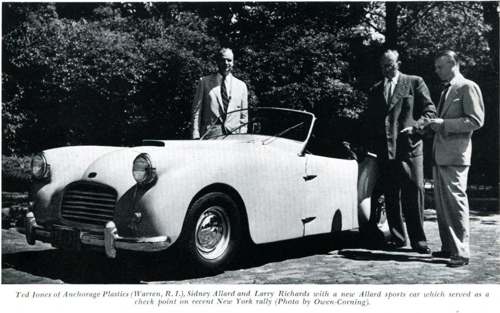 - From Sports Car Magazine (SCCA) Nov.-Dec.1952: Ted Jones of Anchorage Plastics (Warren, Rhode Island), Sidney Allard, and Larry Richards with a new Allard Sports Car which served as a check point on a recent New York rally (Photo by Owen Corning).