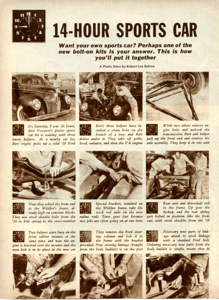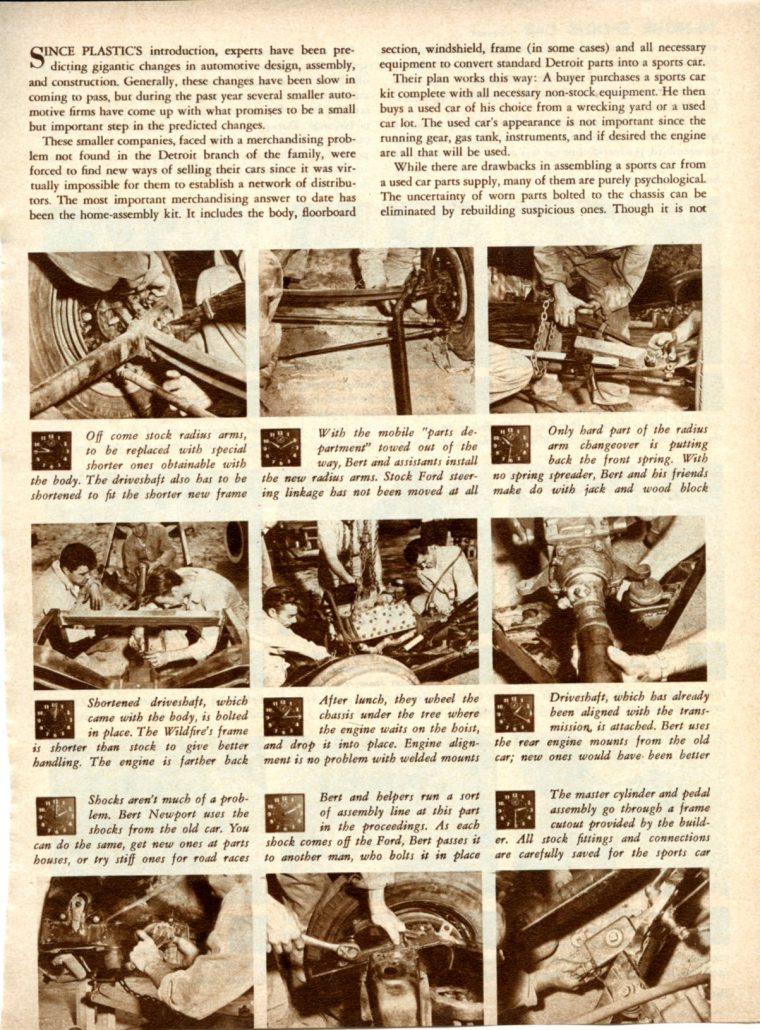 The article that accompanies the inset pictures in the gallery below is not that long, and gives a good overview of how building a sports car was viewed in early 1954. Let’s review the article – I think you’ll enjoy it. Photos and story were by Robert Lee Behme, and I’ll repeat the entire article here: