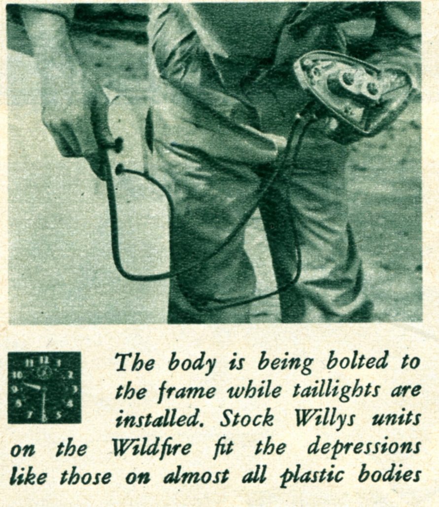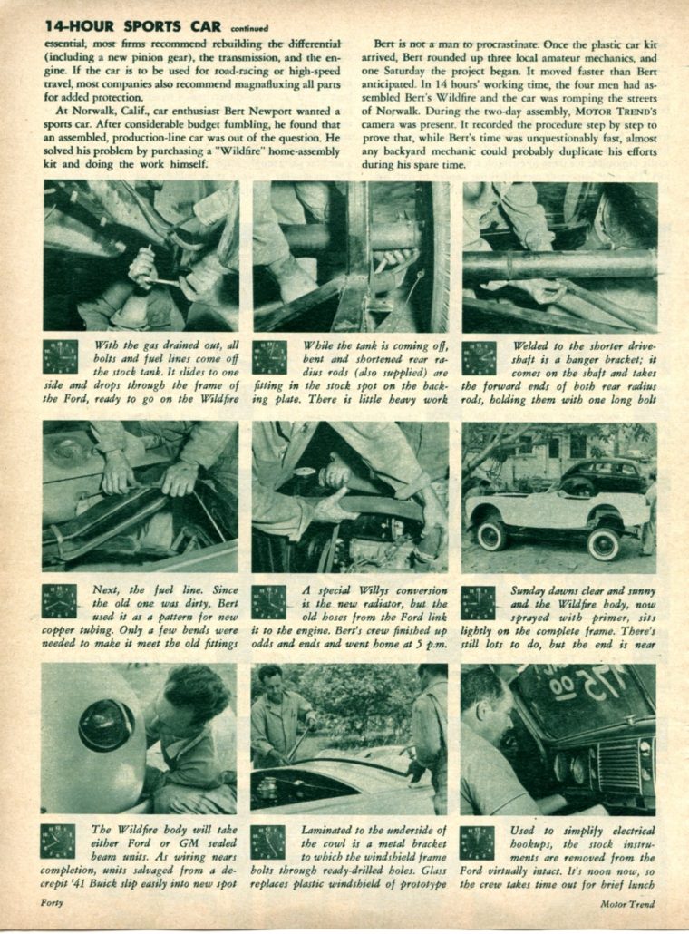 Bert is not a man to procrastinate. Once the plastic car kit arrived, Bert rounded up three local amateur mechanics, and one Saturday the project began. It moved faster than Bert anticipated. In 14 hours’ working time, the four men had assembled Bert’s Wildfire and the car was romping the streets of Norwalk. During the two-day assembly, MOTOR TREND’S camera was present. It recorded the procedure step by step to prove that, while Bert’s time was unquestionably fast, almost any backyard mechanic could probably duplicate his efforts during his spare time.
