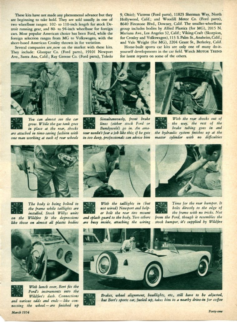 At Norwalk, California, car enthusiast Bert Newport wanted a sports car. After considerable budget fumbling, he found that an assembled, production-line car was out of the question. He solved his problem by purchasing a “Wildfire” home-assembly kit and doing the work himself.