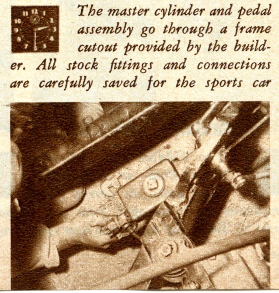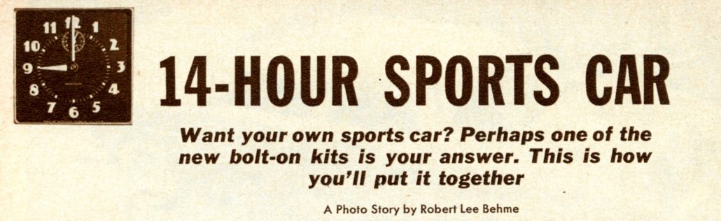Their plan works this way: A buyer purchases a sports car kit complete with all necessary non-stock equipment. He then buys a used car of his choice from a wrecking yard or a used car lot. The used car’s appearance is not important since the running gear, gas tank, instruments, and if desired the engine, are all that will be used.