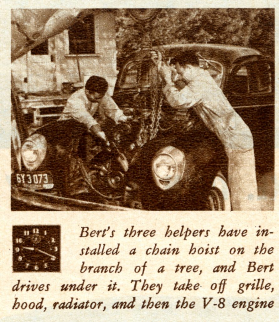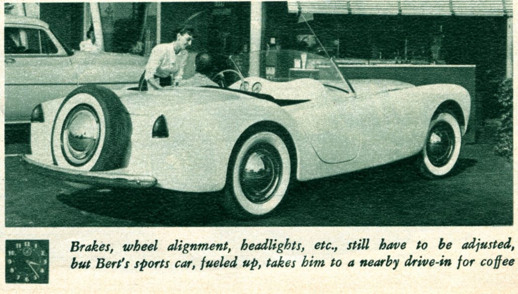 And Lo and Behold – We Had a Car. Here the Caption Reads, “Brakes, Wheel Alignment, Headlights, etc., Still Have to be Adjusted, but Bert’s Sports Car, Fueled Up, Takes Him to a Nearby Drive-In for Coffee.”