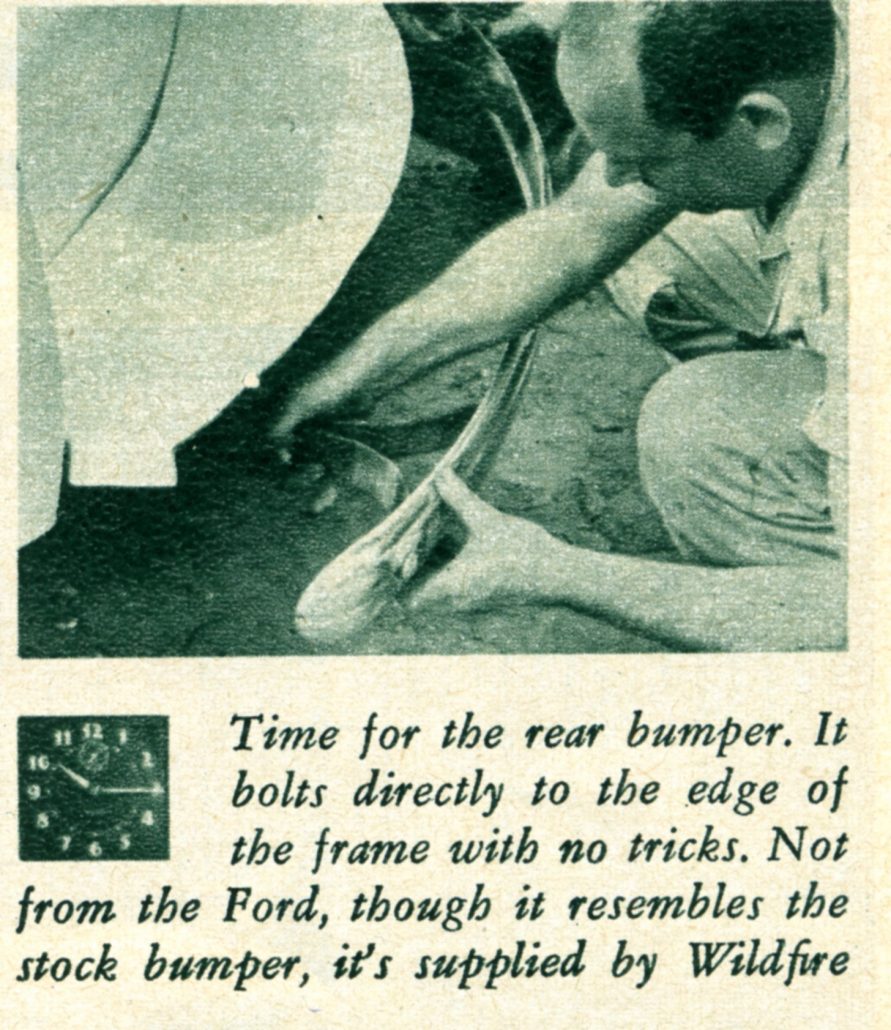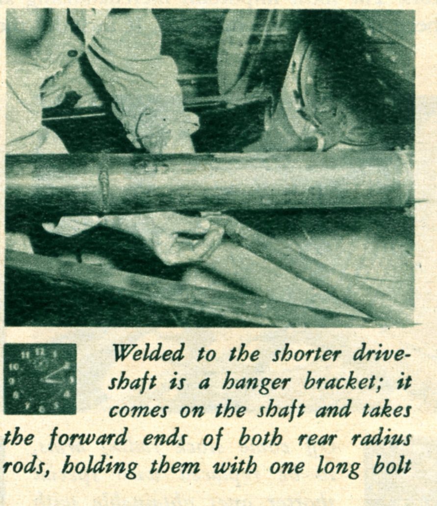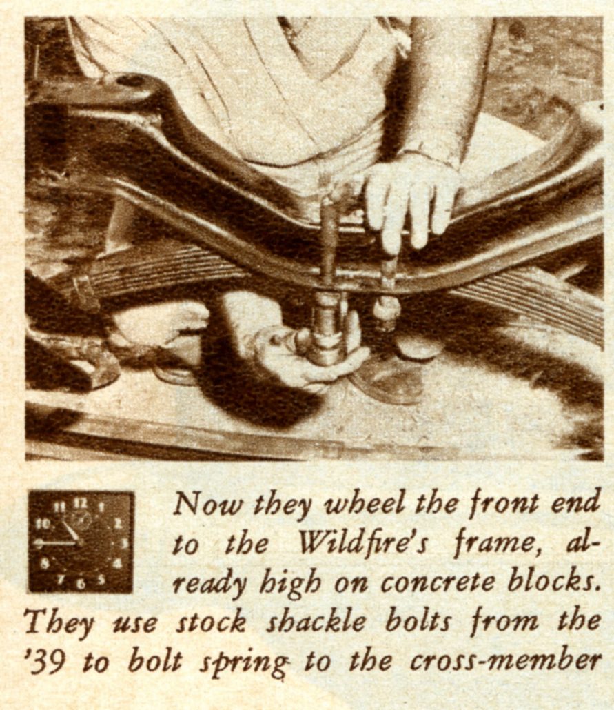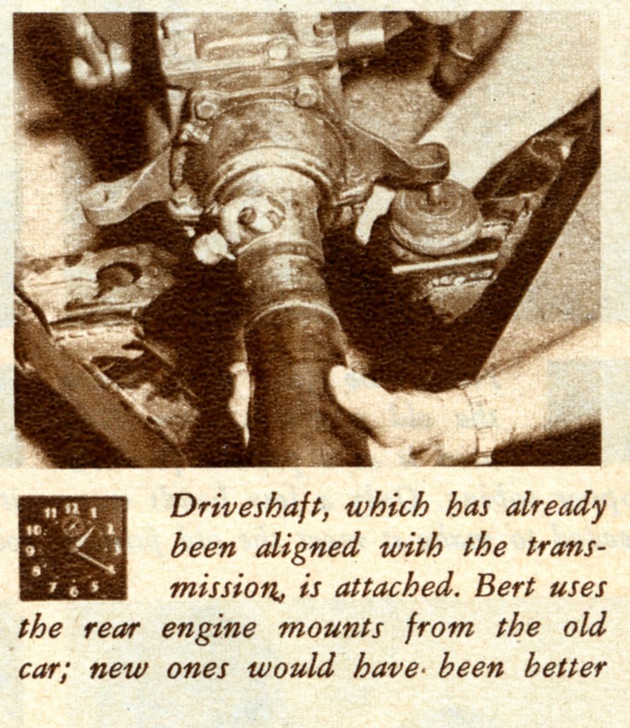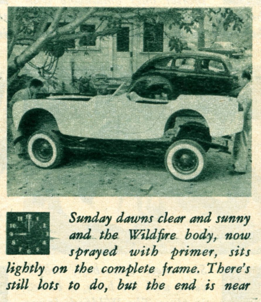 In This Picture at Noon on Saturday, the Caption Reads, “Shortened Driveshaft, Which Came With the Body, is Bolted in Place. The Wildfire’s Frame is Shorter than Stock to Give Better Handling. The Engine is Farther Back.”