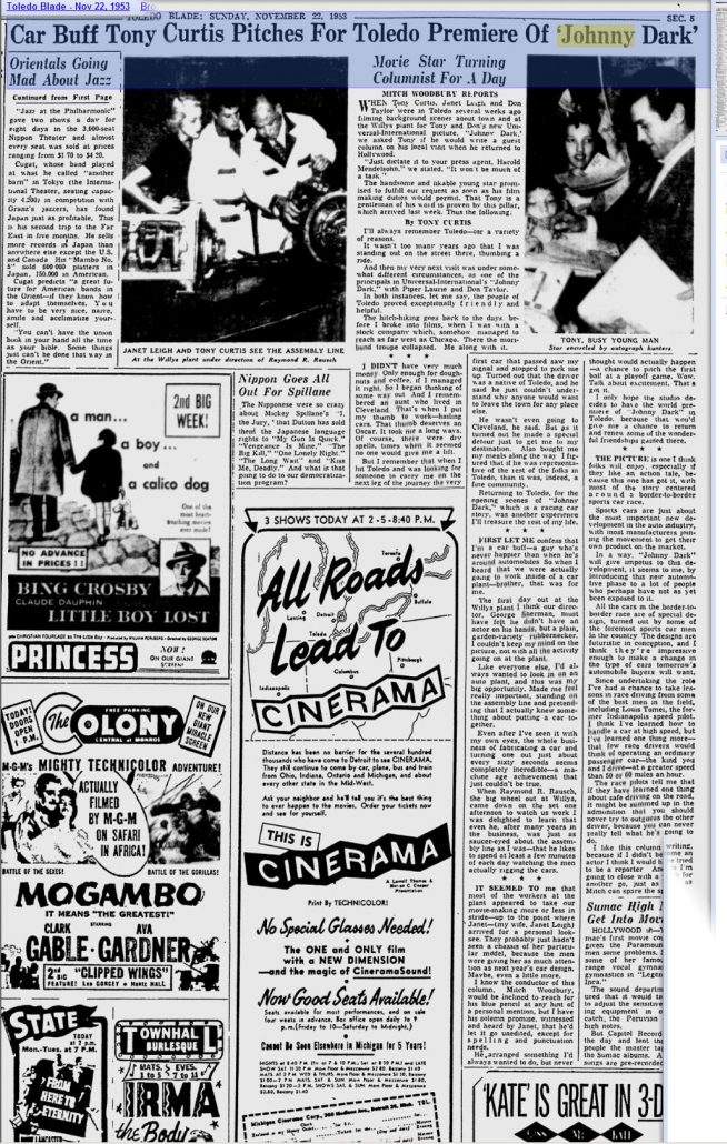 When Tony Curtis, Janet Leigh, and Don Taylor were in Toledo several weeks ago filming background scenes about town at at the Willys plant for Tony and Don’s new Universal-International picture, “Johnny Dark,” we asked Tony if he would write a guest column on his local visit when he returned to Hollywood.