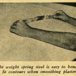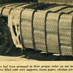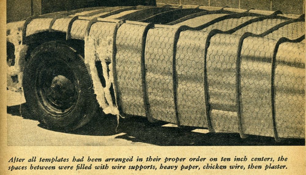 With the wooden mockup completely assembled, wire stringers are stretched between the templates about two inches beneath the surface of the body and spaced about every four inches.  When these are complete, strips of waterproof paper are used to cover the wire so that a good backing will be provided for the plaster.