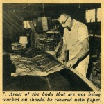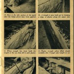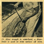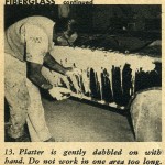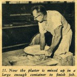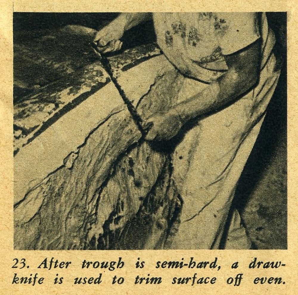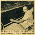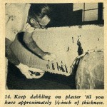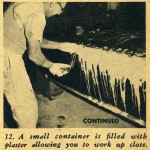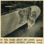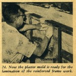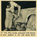 The hemp fiber can be purchased at a building supply house the same as the casting plaster. The method used for applying the help is: first tear off a section of the hemp and saturate it in the dishpan of plaster; next, remove it, ring it out and lay it on the still moist plaster surface of the mold; spread it out flat and with a very light patting action with your hand, working the saturated hemp into the moist surface of the mold.