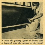 Stearic acid is generally used, but any light oily or greasy substance will work. After coating the surface with the parting agent, you then sprinkle the object with a powdered chalk. A dry-brush technique is now employed, brushing and rebrushing the surface to a very smooth finish.