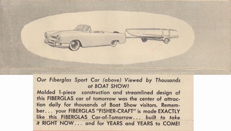 “Our fiberglass sports car (above) viewed by thousands at boat show! Molded 1-piece construction and streamlined design of this fiberglass car of tomorrow was the center of attraction daily for thousands of boat show visitors. Remember…..your fiberglass “Fisher-Craft” is made exactly like this fiberglass “Car-Of-Tomorrow”….built to take it right now….and for years and years to come!”