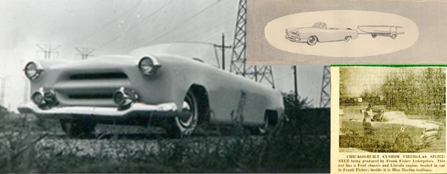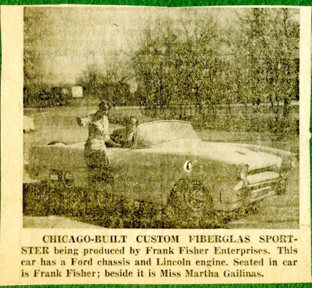 “Chicago Built Custom Fiberglass Sportster being produced by Frank Fisher Enterprises. This car has a Ford chassis and Lincoln engine. Seated in car is Frank Fisher; beside it is Miss Martha Gailinas.”