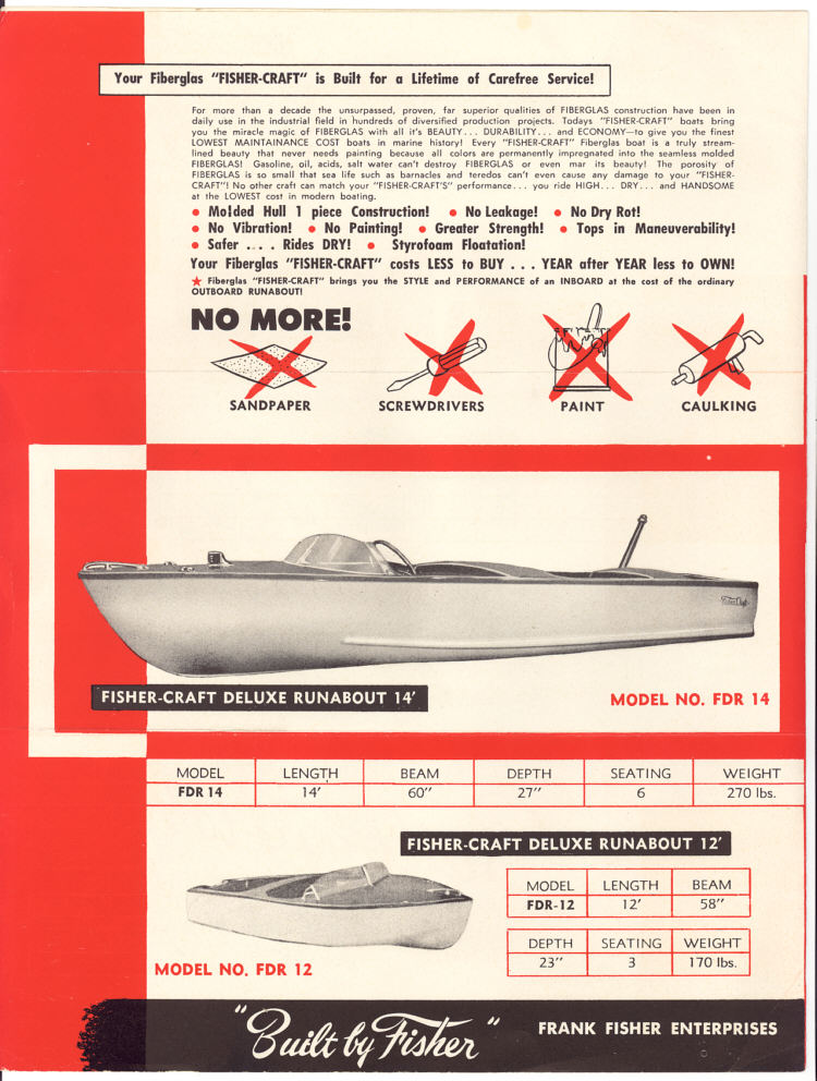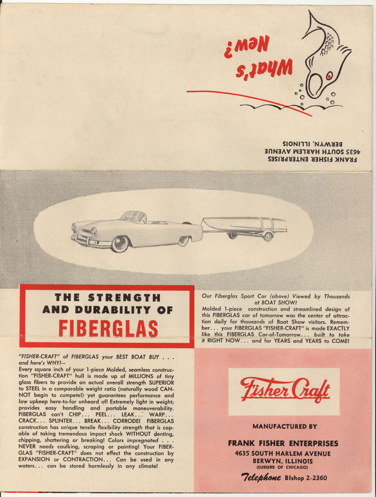 On their website was a brochure from “Fisher Craft Fiberglass Boats” with the slogan “Built by Fisher” and the tell tale signature “Frank Fisher Enterprises, Berwyn, Illinois.”